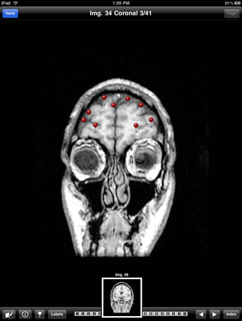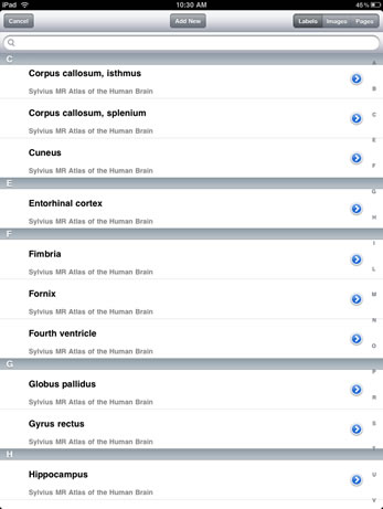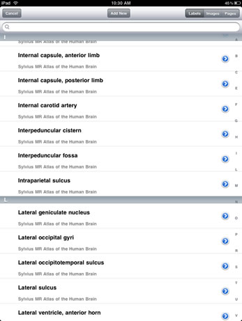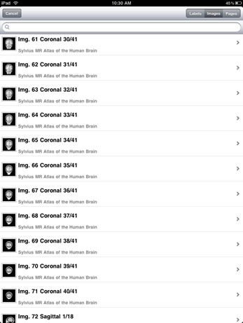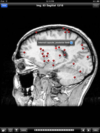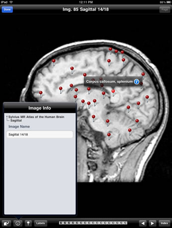 Sylvius MR is a customizable neuroanatomy learning and reference tool utilizing images and annotations from Sylvius, the benchmark application for exploring and understanding the anatomy of the human central nervous system. 31 axial, 40 coronal, and 17 sagittal T1-weighted magnetic resonance images contain over 2493 structure annotations, with concise text describing brain structures and their functional significance.