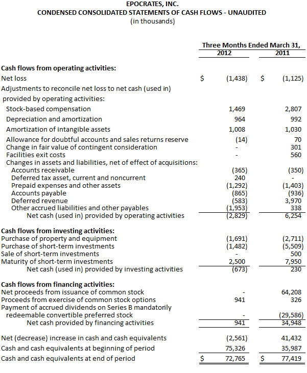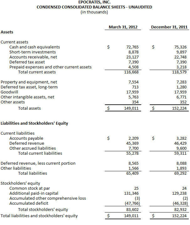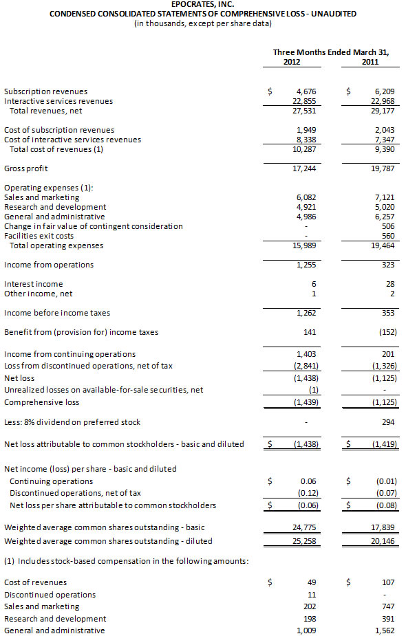 - Net loss was $1.4 million for the quarter ended March 31, 2012 versus $1.1 million for the quarter ended March 31, 2011. The net loss in Q1 2012 was impacted by decreased revenue and increased costs associated with discontinued operations, offset by a decrease in operating expenses. Following the previously disclosed strategic decision to discontinue the Epocrates EHR solution, the EHR business is presented as discontinued operations for both Q1 2012 and Q1 2011.